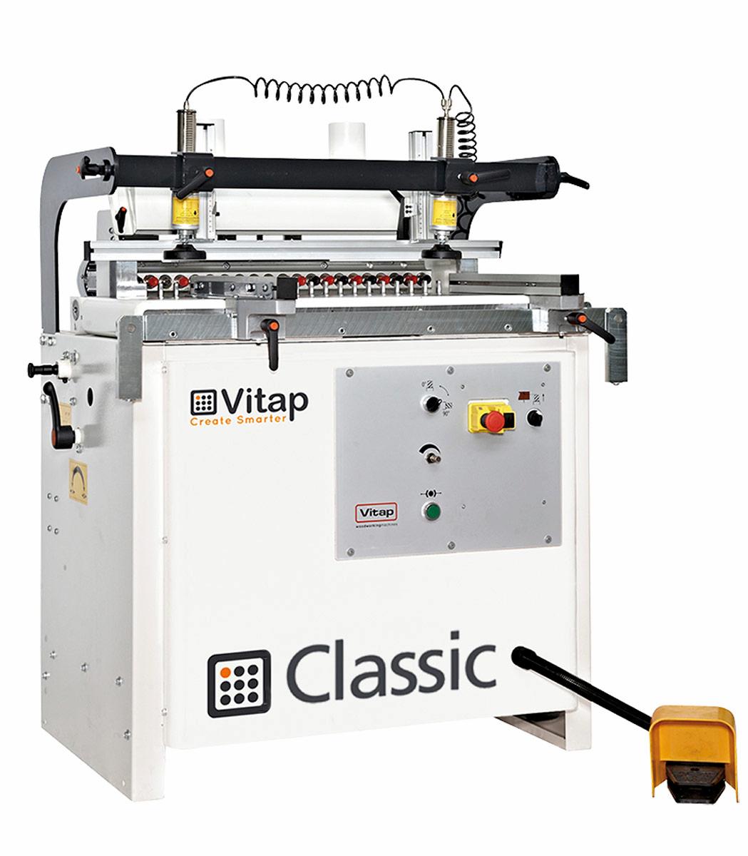Vitap Alfa Classic es una de las máquinas perforadoras semiautomáticas diseñadas para la pequeña y mediana producción. Equipada con 21 mandriles, es una máquina universal para perforar el panel y la madera sólida con una mecha de acero.